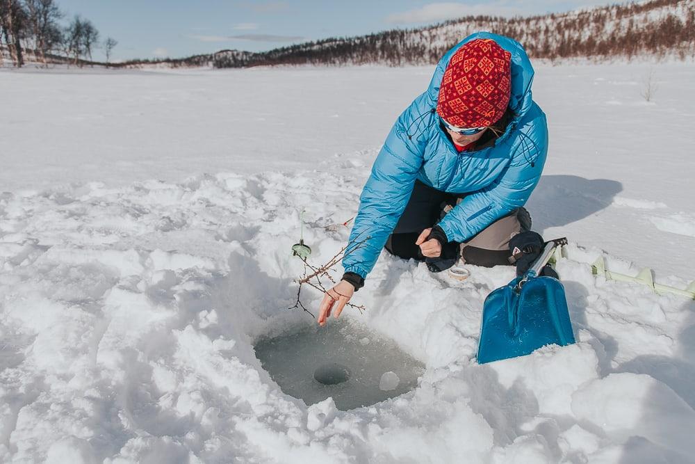 Instead of the usual short 1-2 hour trip to experience husky sledding, we loaded up our sleds with supplies and headed up for a day in the mountains. We stopped at a frozen lake, where we unharnessed the dogs and set out building a fire and digging holes in the ice to go ice fishing.